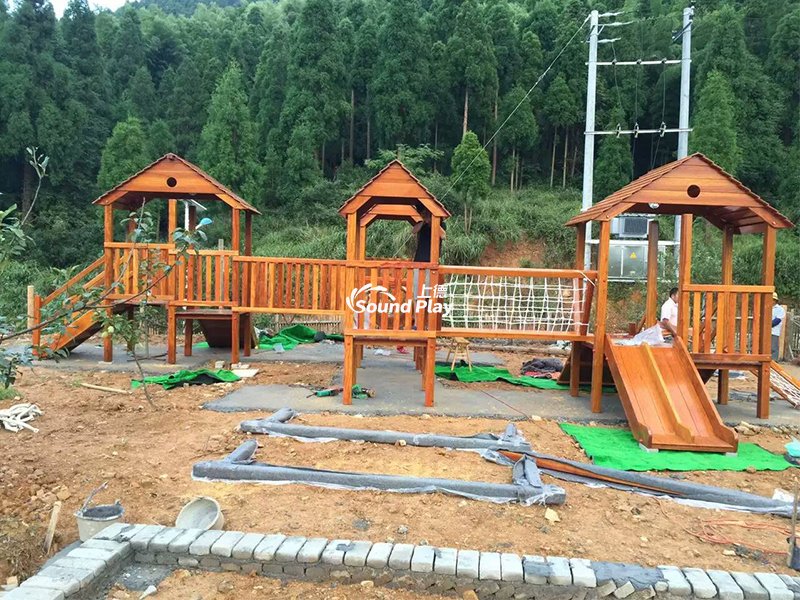 天津某大型幼儿园户外定制木质滑梯施工